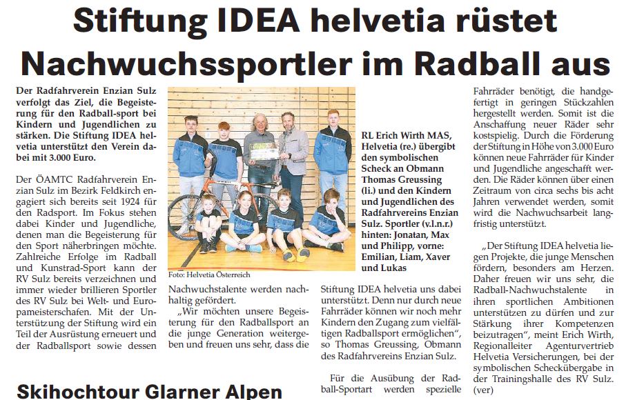 Stiftung IDEA Helvetia rüstet Nachwuchssportler im Radball aus | |